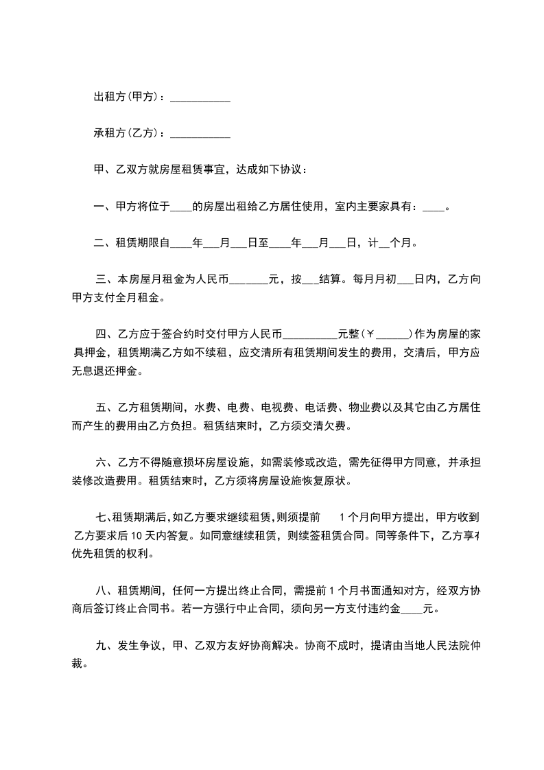 一、甲方将位于____的房屋出租给乙方居住使用,室内主要家具有:____。