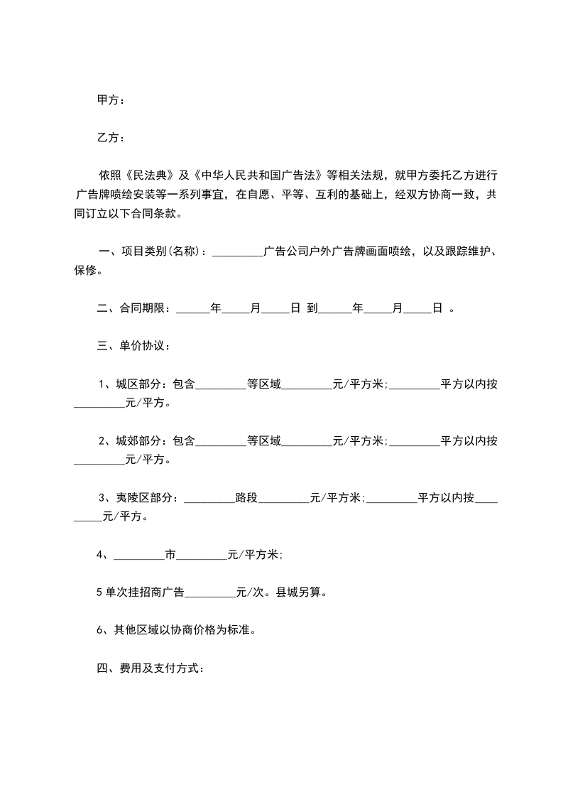 依照《民法典》及《中华人民共和国广告法》等相关法规,就甲方委托乙方进行广告牌喷绘安装等一系列事宜,在自愿、平等、互利的基础上,经双方协商一致,共同订立以下合同条款。