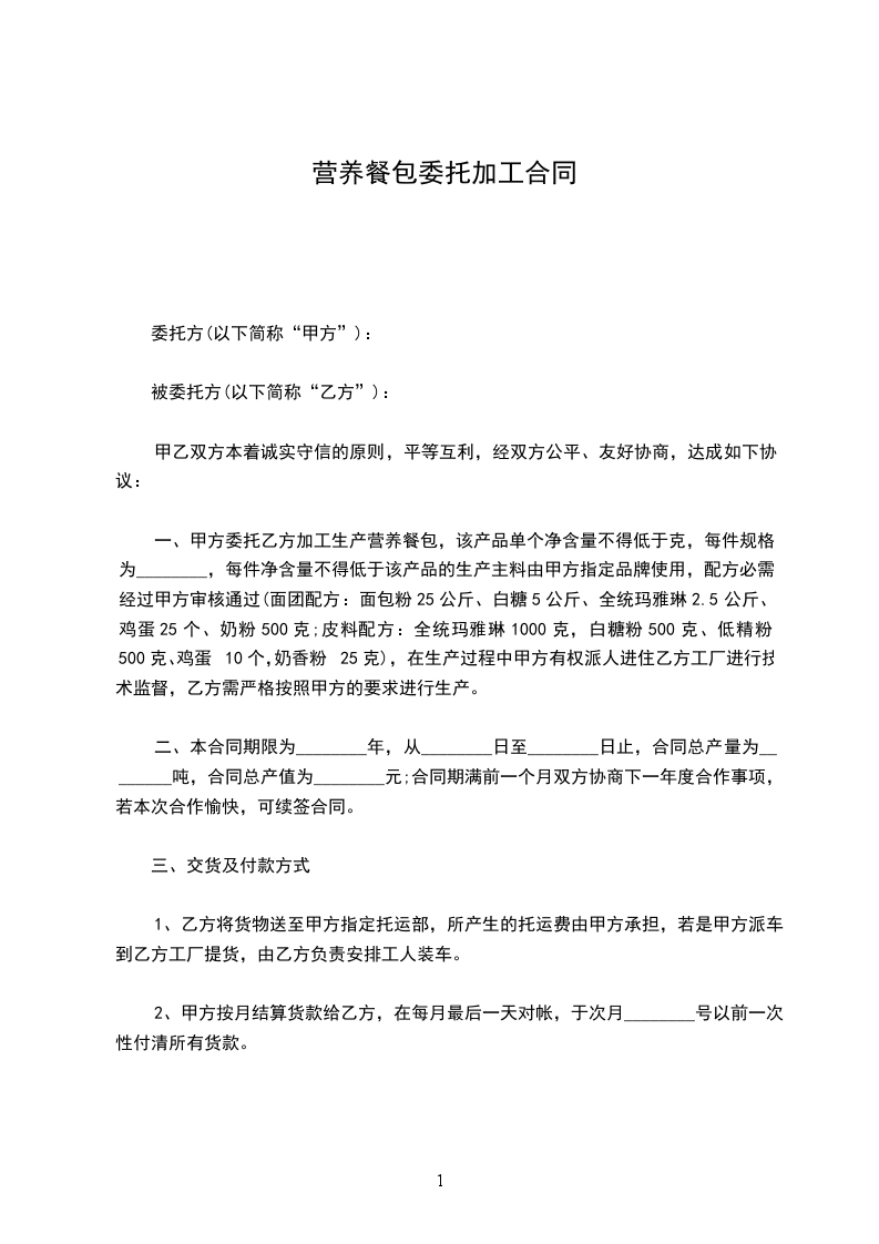 一、甲方委托乙方加工生产营养餐包,该产品单个净含量不得低于克,每件规格为________,每件净含量不得低于该产品的生产主料由甲方指定品牌使用,配方必需经过甲方审核通过(面团配方:面包粉25公斤、白糖5公斤、全统玛雅琳2.5公斤、鸡蛋25个、奶粉500克;皮料配方:全统玛雅琳1000克,白糖粉500克、低精粉500克、鸡蛋10个,奶香粉25克),在生产过程中甲方有权派人进住乙方工厂进行技术监督,乙方需严格按照甲方的要求进行生产。