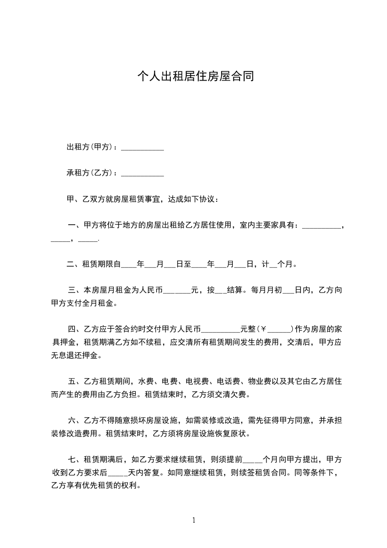 一、甲方将位于地方的房屋出租给乙方居住使用,室内主要家具有:__________,_____,_____.