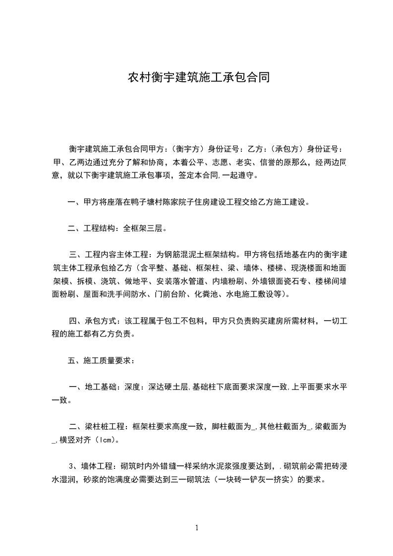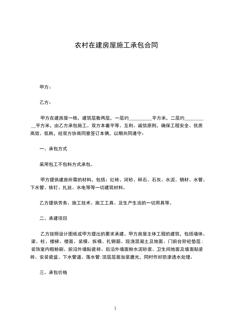 甲方在建房屋一栋,建筑层数两层,一层约__________平方米,二层约__________平方米,由乙方承包施工。双方本着平等、互利、诚信原则,确保工程安全、优质、高效、低耗,经双方协商同意签订本俩,以期共同遵守:
