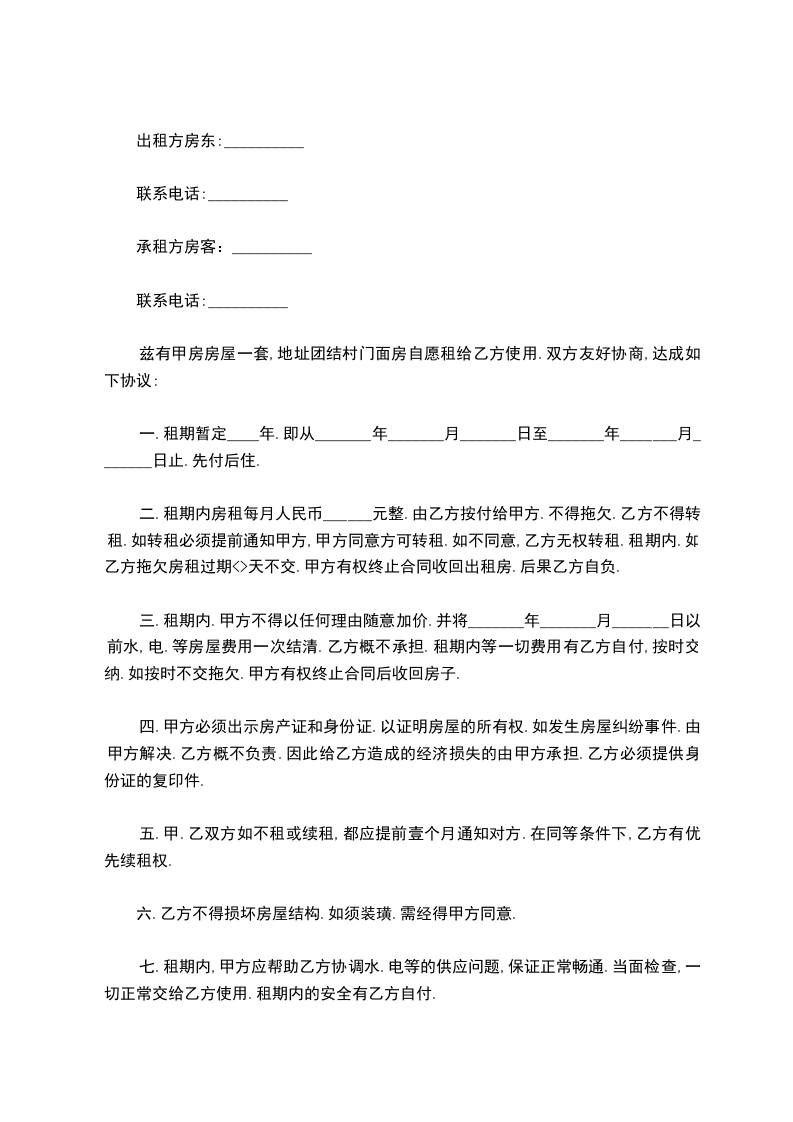 兹有甲房房屋一套,地址团结村门面房自愿租给乙方使用.双方友好协商,达成如下协议: