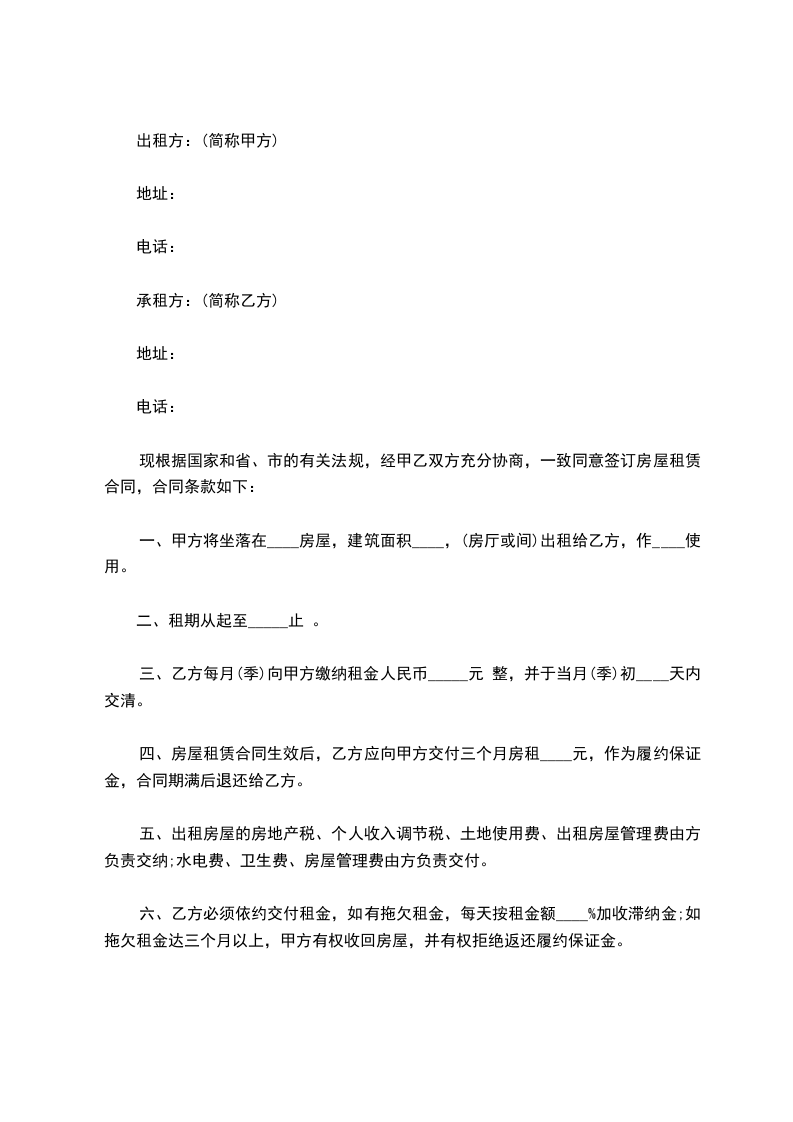 现根据国家和省、市的有关法规,经甲乙双方充分协商,一致同意签订房屋租赁合同,合同条款如下:
