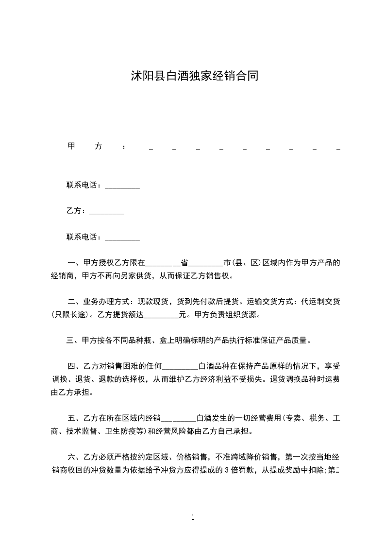 五、乙方在所在区域内经销_________白酒发生的一切经营费用(专卖、税务、工商、技术监督、卫生防疫等)和经营风险都由乙方自己承担。