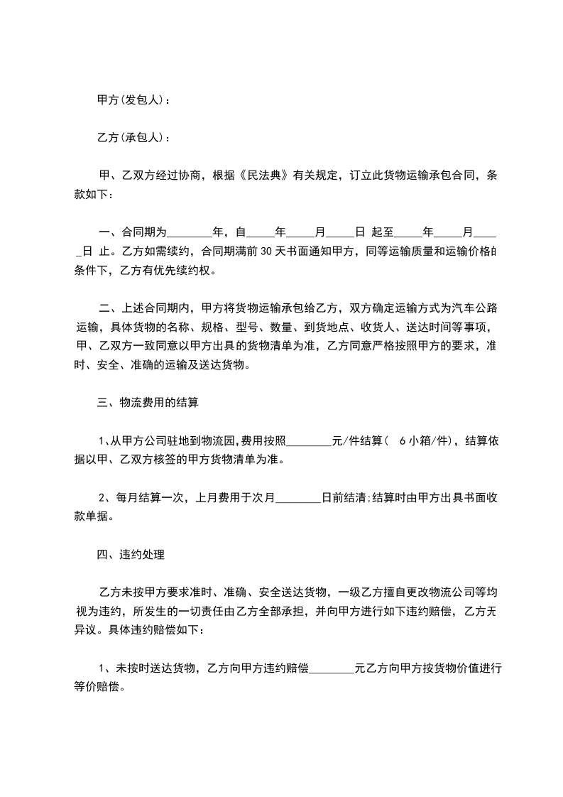 甲、乙双方经过协商,根据《民法典》有关规定,订立此货物运输承包合同,条款如下: