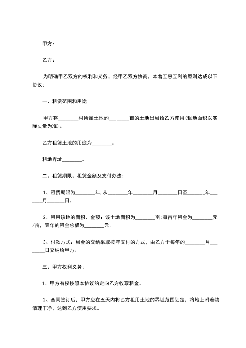 甲方将________村所属土地约________亩的土地出租给乙方使用(租地面积以实际丈量为准)。