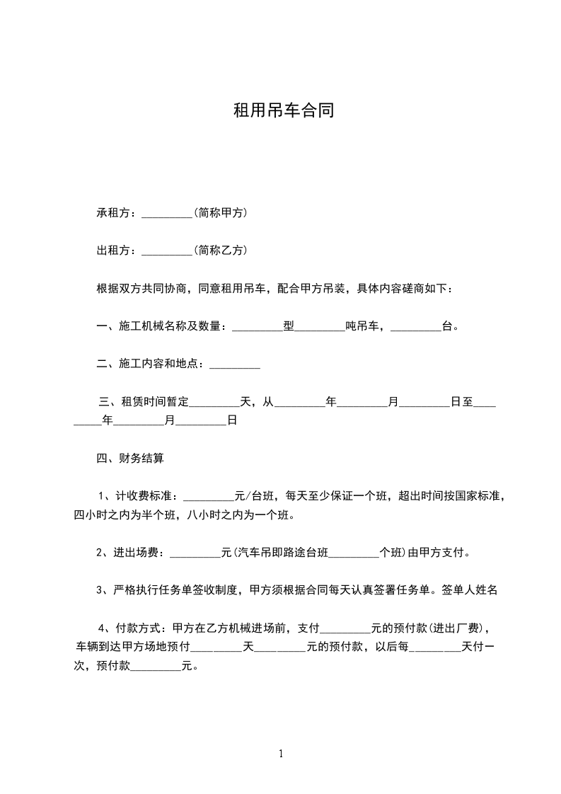 2、进出场费:_________元(汽车吊即路途台班_________个班)由甲方支付。