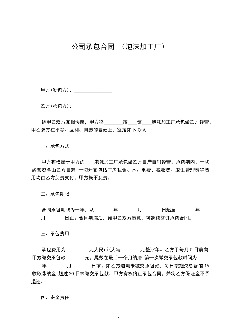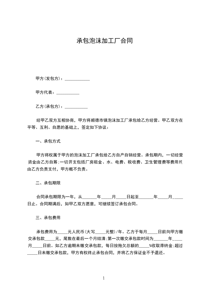 经甲乙双方互相协商,甲方将_____泡沫加工厂承包给乙方经营。甲乙双方在平等、互利、自愿的基础上,签定如下协议: