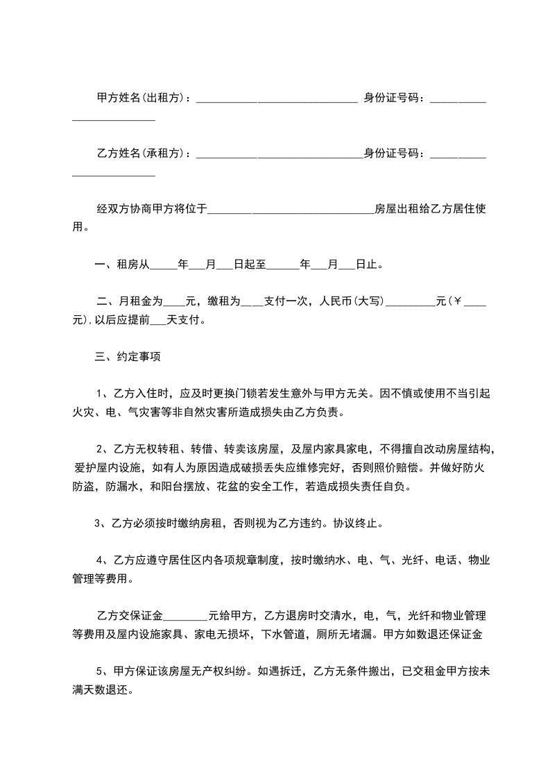 乙方交保证金________元给甲方,乙方退房时交清水,电,气,光纤和物业管理等费用及屋内设施家具、家电无损坏,下水管道,厕所无堵漏。甲方如数退还保证金。