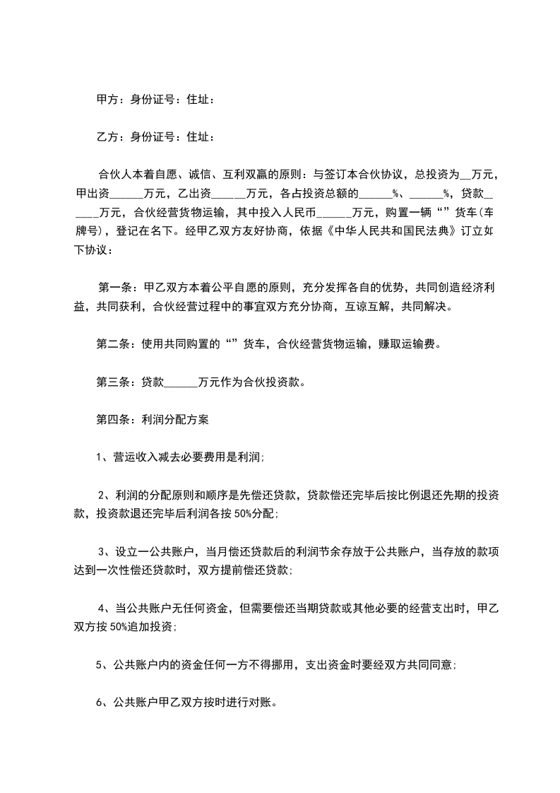 合伙人本着自愿、诚信、互利双赢的原则:与签订本合伙协议,总投资为__万元,甲出资______万元,乙出资______万元,各占投资总额的______%、______%,贷款______万元,合伙经营货物运输,其中投入人民币______万元,购置一辆“”货车(车牌号),登记在名下。经甲乙双方友好协商,依据《中华人民共和国民法典》订立如下协议: