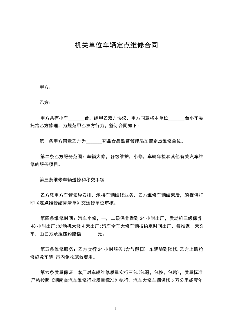 第一条甲方同意乙方为_______药品食品监督管理局车辆定点维修单位。