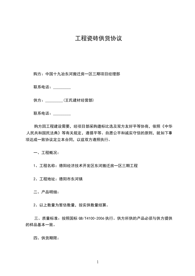 三、质量标准:按照国标GB/T4100-2006执行。供方所供的产品必须与供方提供的样品基本一致。