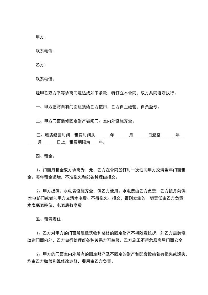 1、门面月租金双方协商为__元,乙方在合同签订时一次性向甲方交清当年门面租金。每年租金递增,不准拖欠和以各种理由拒交。