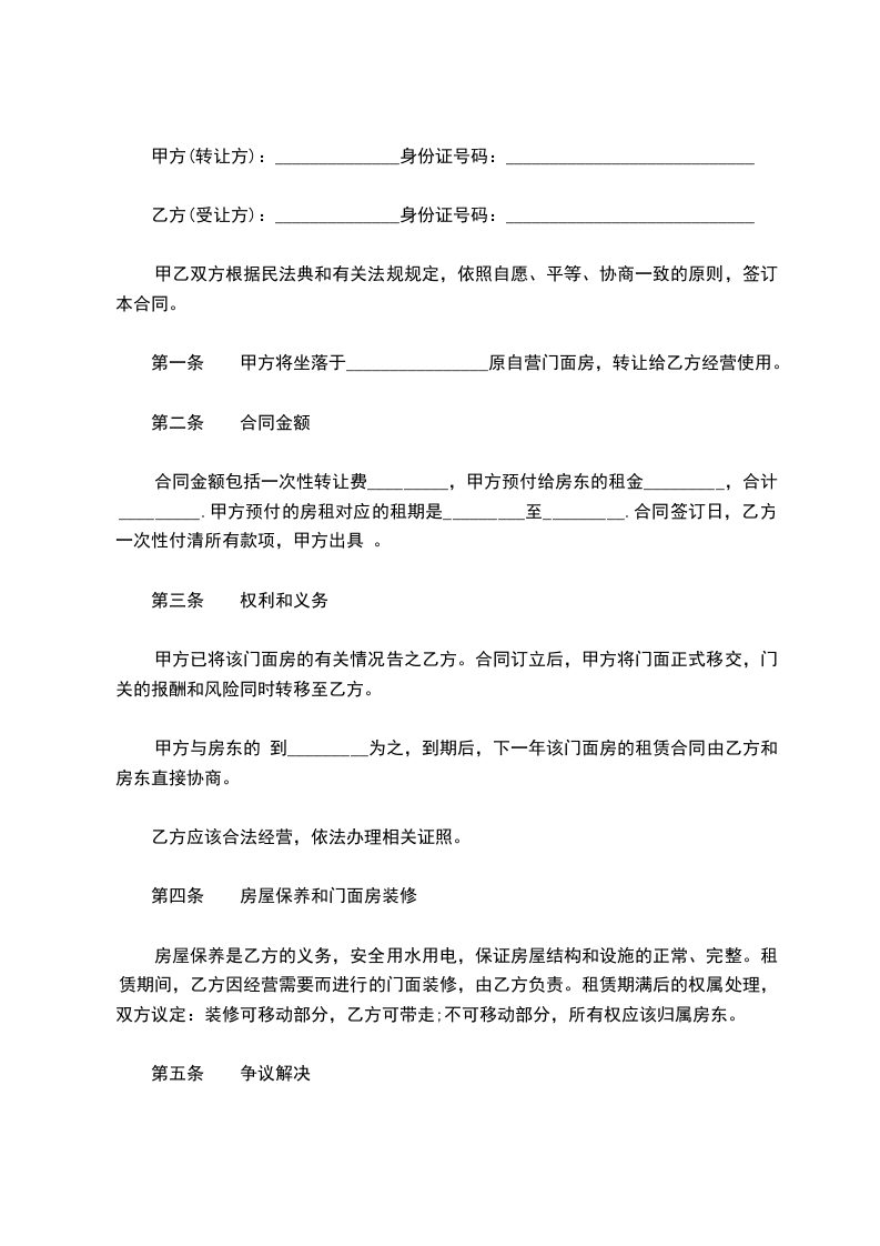 乙方不得将甲方门面单方面和因其他理由为由转租给他人经营和使用,否则视为乙方违约,甲方有权收回门面,终止乙方合同。乙方若有特殊情况,需转让门面必须经得甲方先同意,门面租金由甲方决定,对乙方无权作主,否则由此引起的一切经济纠纷和刑事责任一切都由乙方负责。