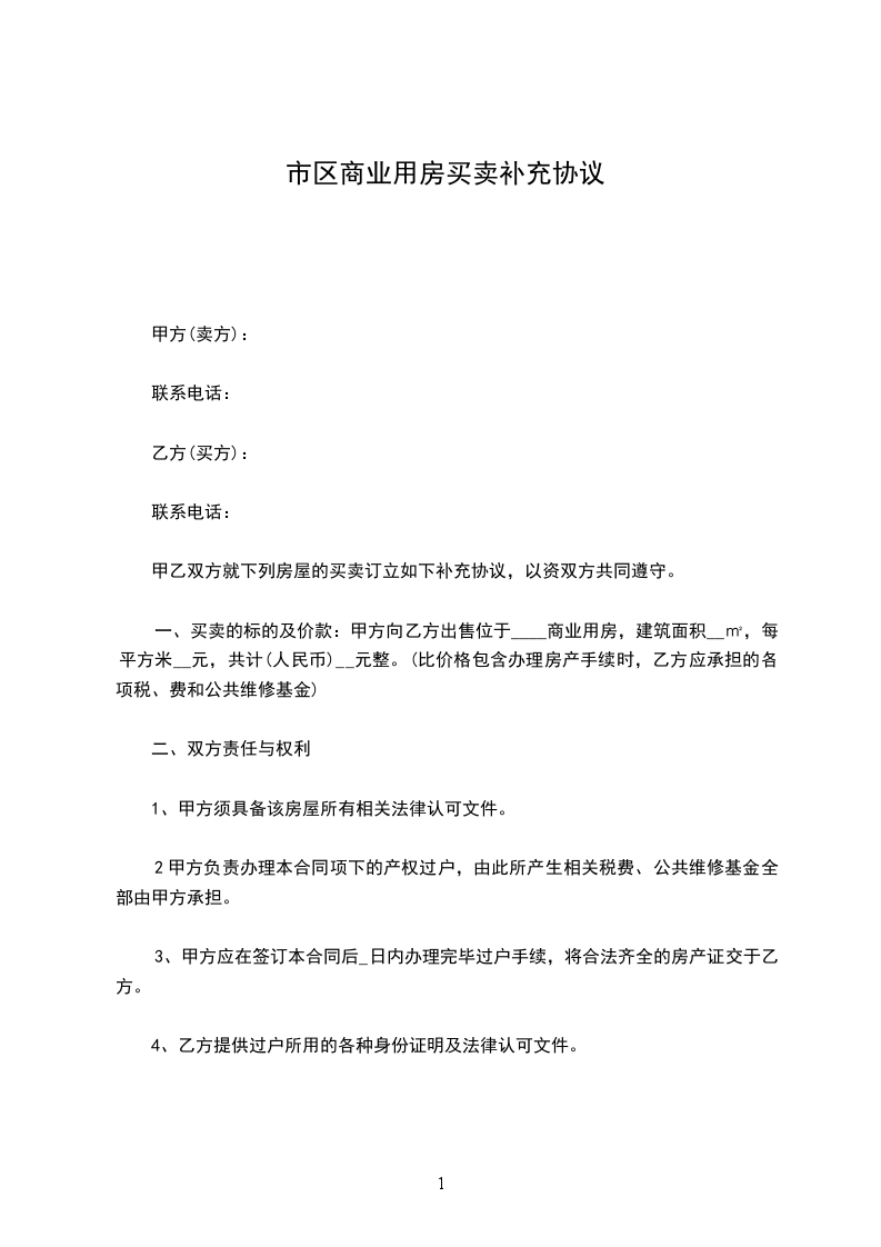 一、买卖的标的及价款:甲方向乙方出售位于____商业用房,建筑面积__㎡,每平方米__元,共计(人民币)__元整。(比价格包含办理房产手续时,乙方应承担的各项税、费和公共维修基金)