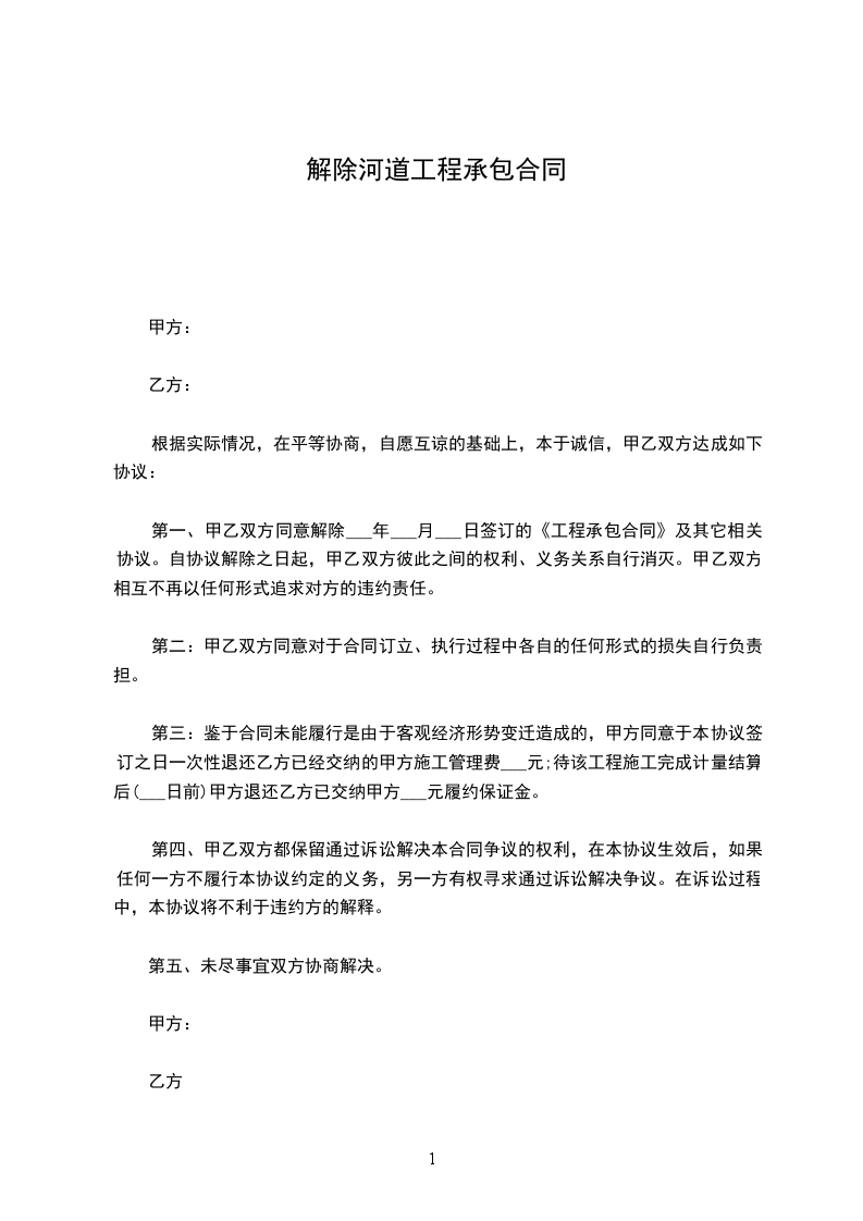 第一、甲乙双方同意解除___年___月___日签订的《工程承包合同》及其它相关协议。自协议解除之日起,甲乙双方彼此之间的权利、义务关系自行消灭。甲乙双方相互不再以任何形式追求对方的违约责任。
