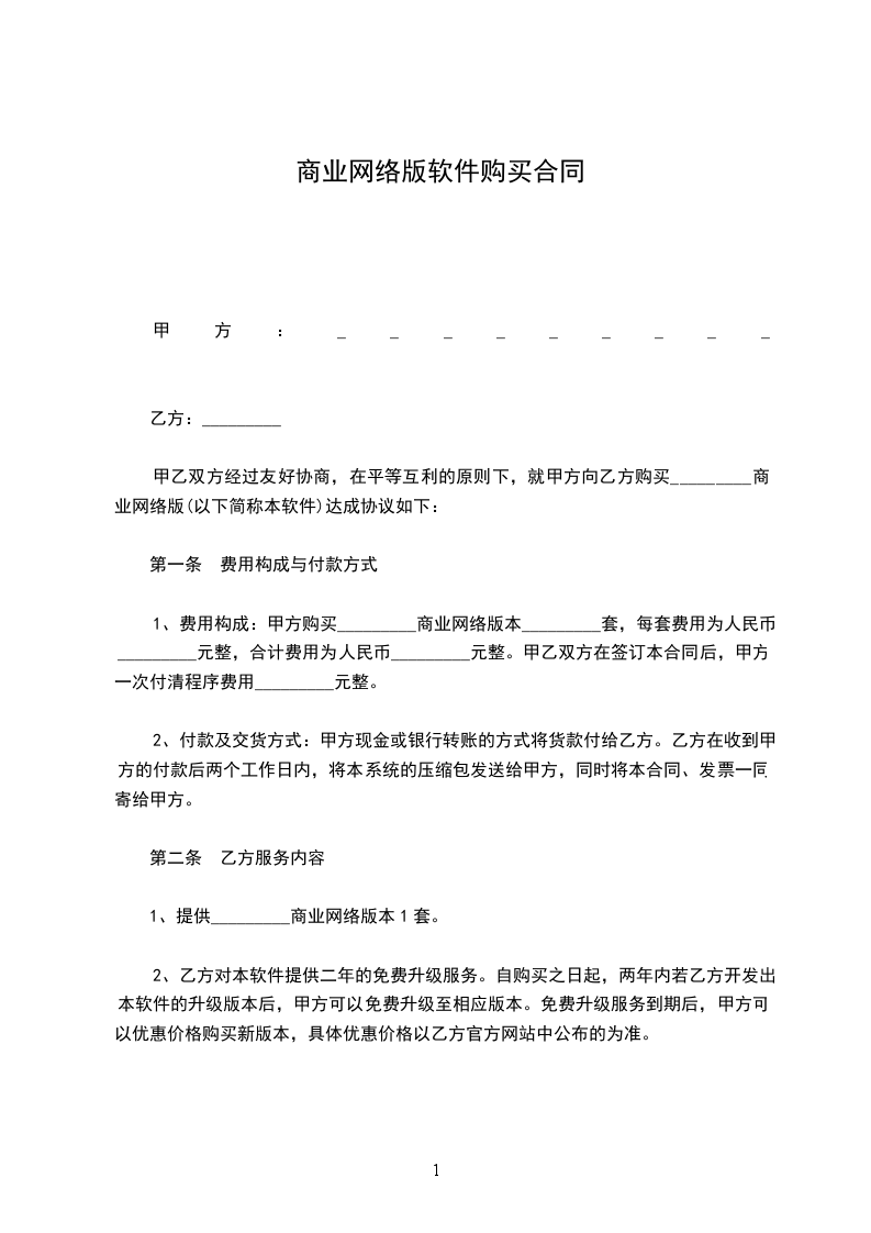 甲乙双方经过友好协商,在平等互利的原则下,就甲方向乙方购买_________商业网络版(以下简称本软件)达成协议如下: