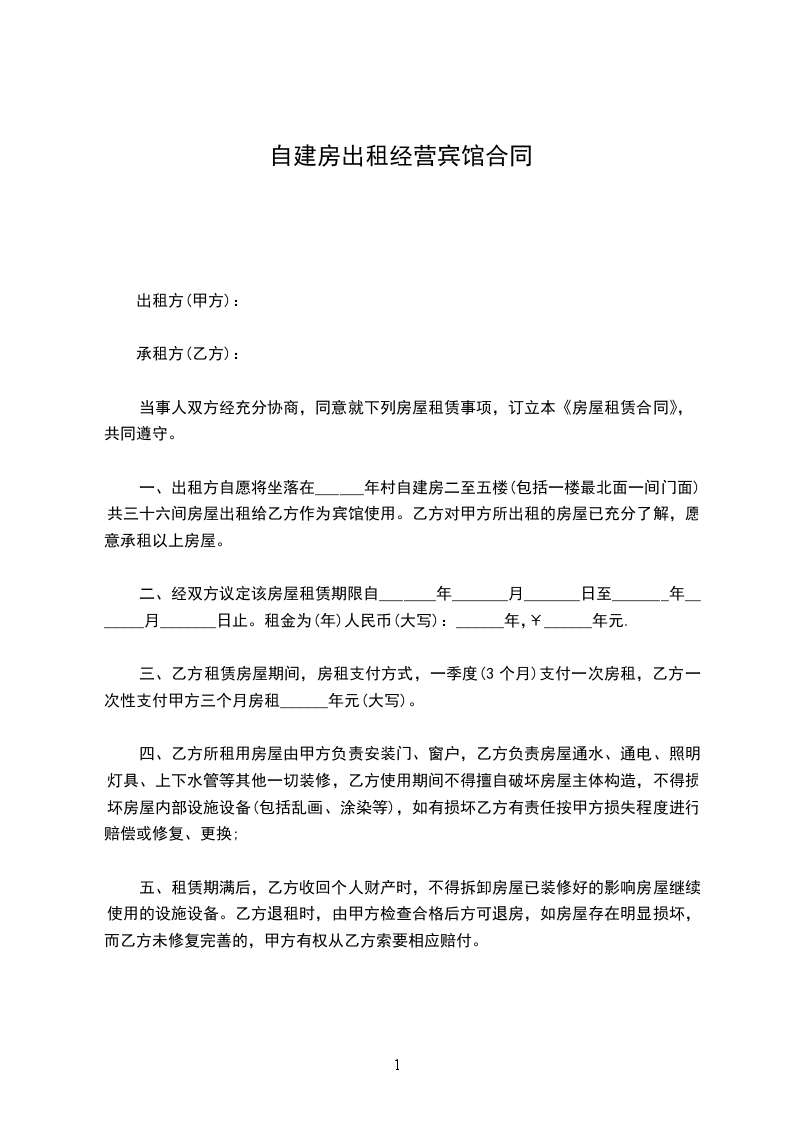 一、出租方自愿将坐落在______年村自建房二至五楼(包括一楼最北面一间门面)共三十六间房屋出租给乙方作为宾馆使用。乙方对甲方所出租的房屋已充分了解,愿意承租以上房屋。