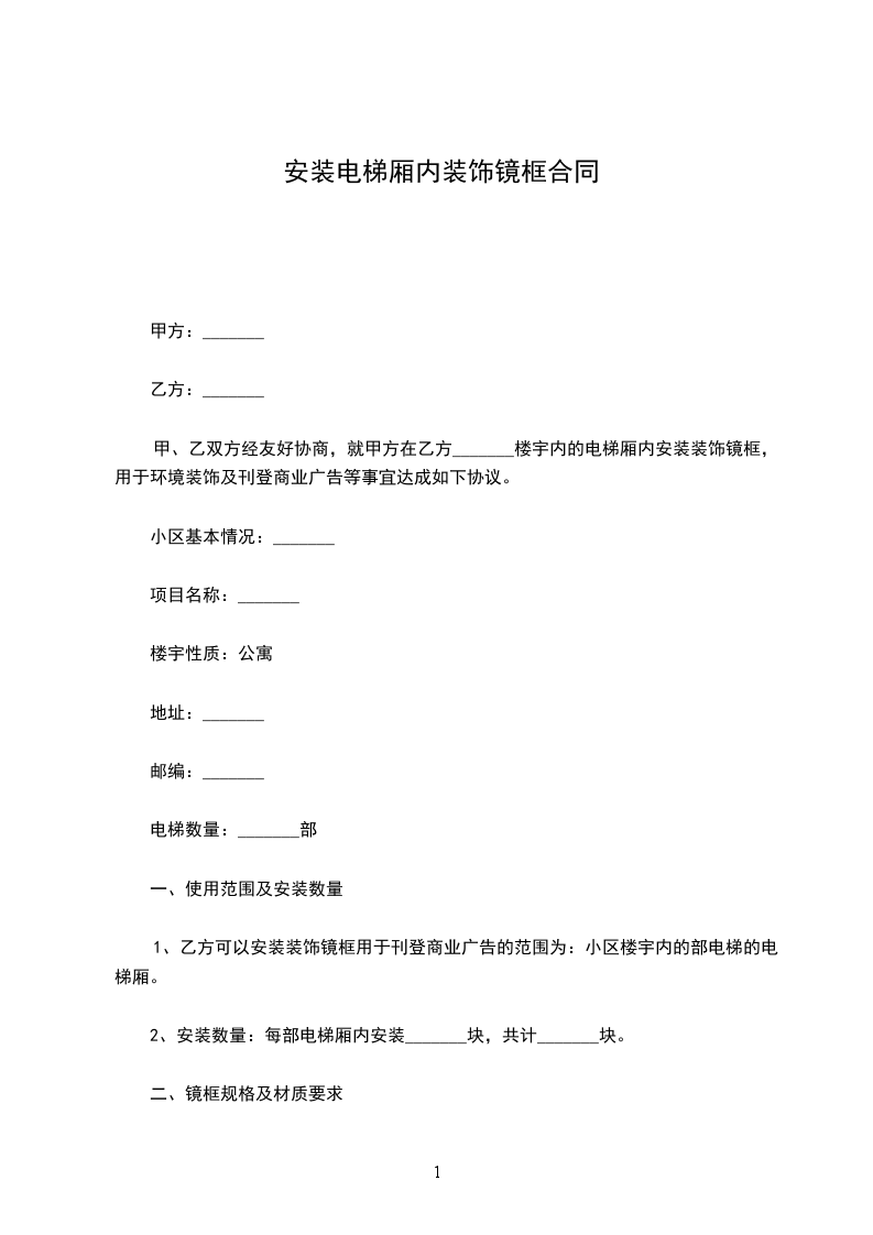 甲、乙双方经友好协商,就甲方在乙方____楼宇内的电梯厢内安装装饰镜框,用于环境装饰及刊登商业广告等事宜达成如下协议。