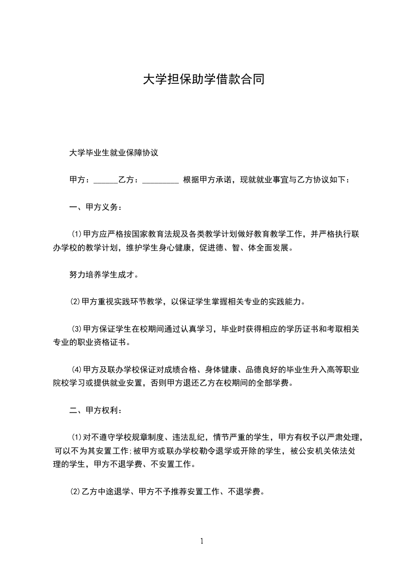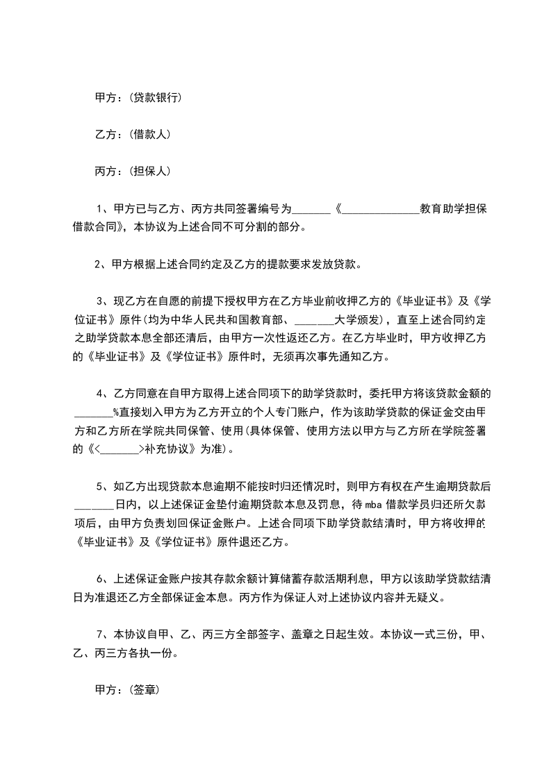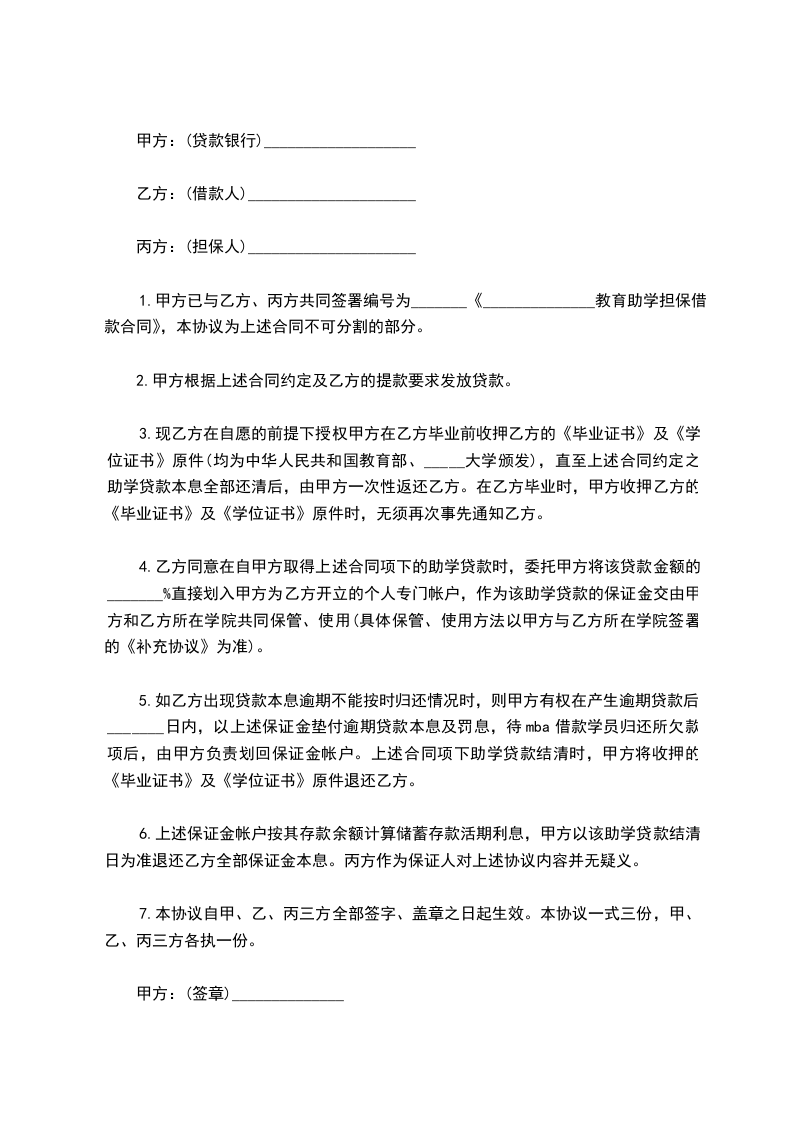 1、甲方已与乙方、丙方共同签署编号为_______《______________教育助学担保借款合同》,本协议为上述合同不可分割的部分。
