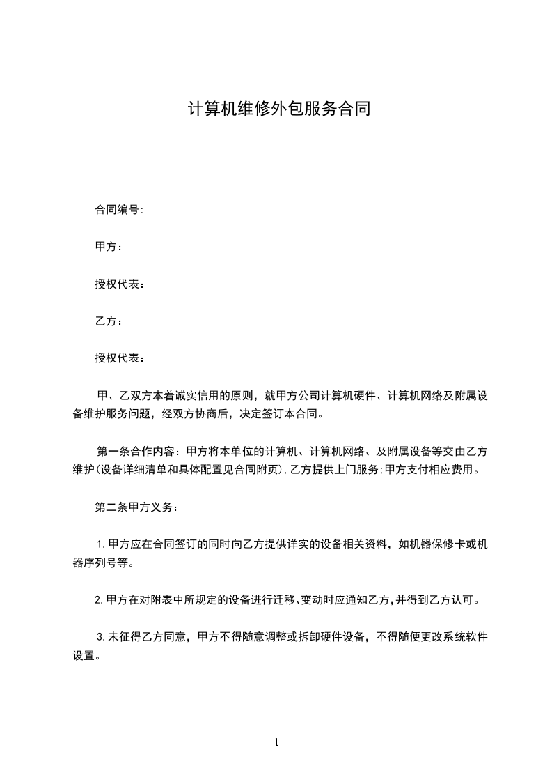 第一条合作内容:甲方将本单位的计算机、计算机网络、及附属设备等交由乙方维护(设备详细清单和具体配置见合同附页),乙方提供上门服务;甲方支付相应费用。