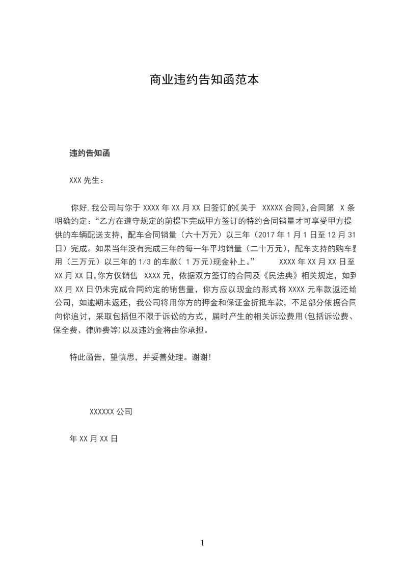 你好,我公司与你于XXXX年XX月XX日签订的《关于XXXXX合同》,合同第X条明确约定:“乙方在遵守规定的前提下完成甲方签订的特约合同销量才可享受甲方提供的车辆配送支持,配车合同销量(六十万元)以三年(2024年1月1日至12月31日)完成。如果当年没有完成三年的每一年平均销量(二十万元),配车支持的购车费用(三万元)以三年的1/3的车款(1万元)现金补上。” XXXX年XX月XX日至XX月XX日,你方仅销售XXXX元,依据双方签订的合同及《民法典》相关规定,如到XX月XX日仍未完成合同约定的销售量,你方应以现金的形式将XXXX元车款返还给公司,如逾期未返还,我公司将用你方的押金和保证金折抵车款,不足部分依据合同向你追讨,采取包括但不限于诉讼的方式,届时产生的相关诉讼费用(包括诉讼费、保全费、律师费等)以及违约金将由你承担。