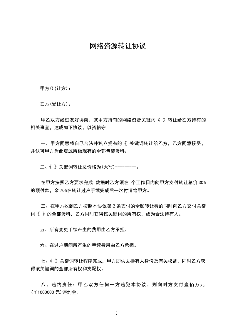 甲乙双方经过友好协商,就甲方持有的网络资源关键词《 》转让给乙方持有的相关事宜,达成如下协议,以资信守: