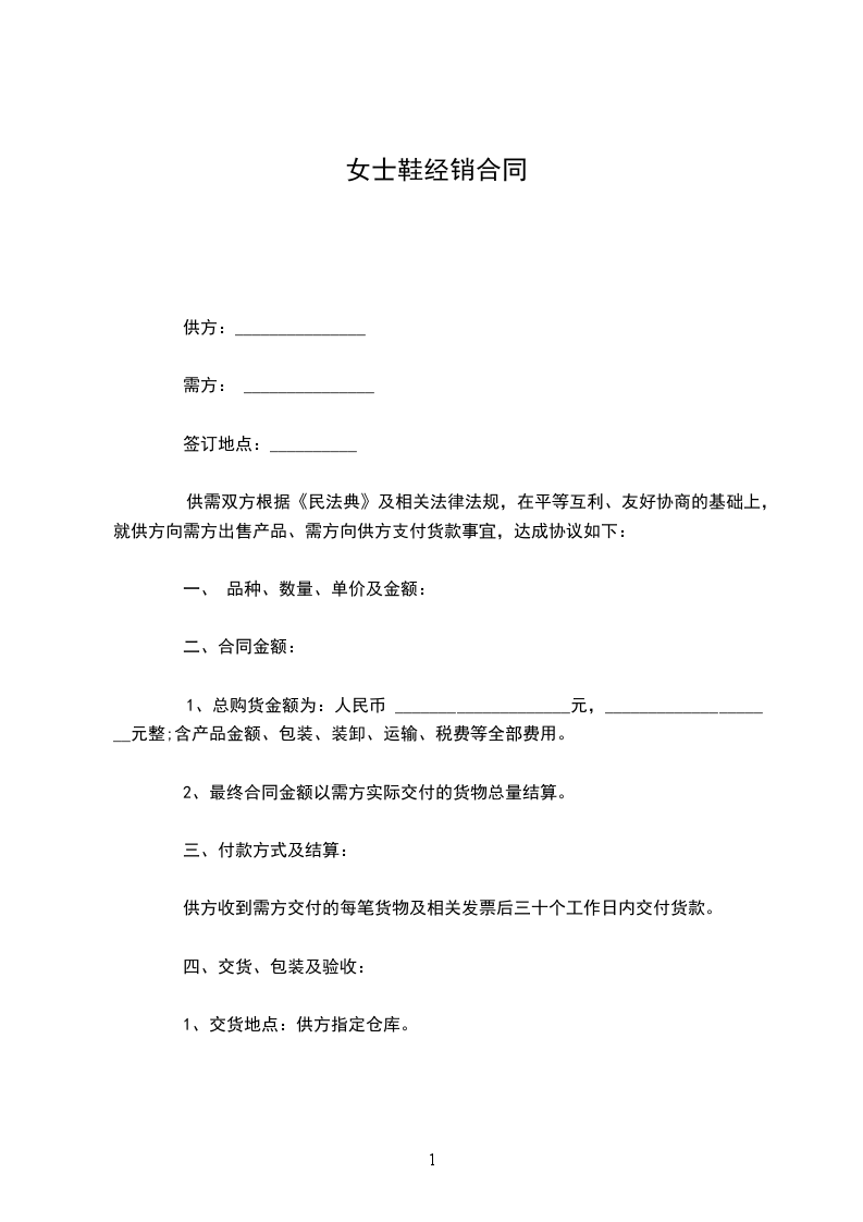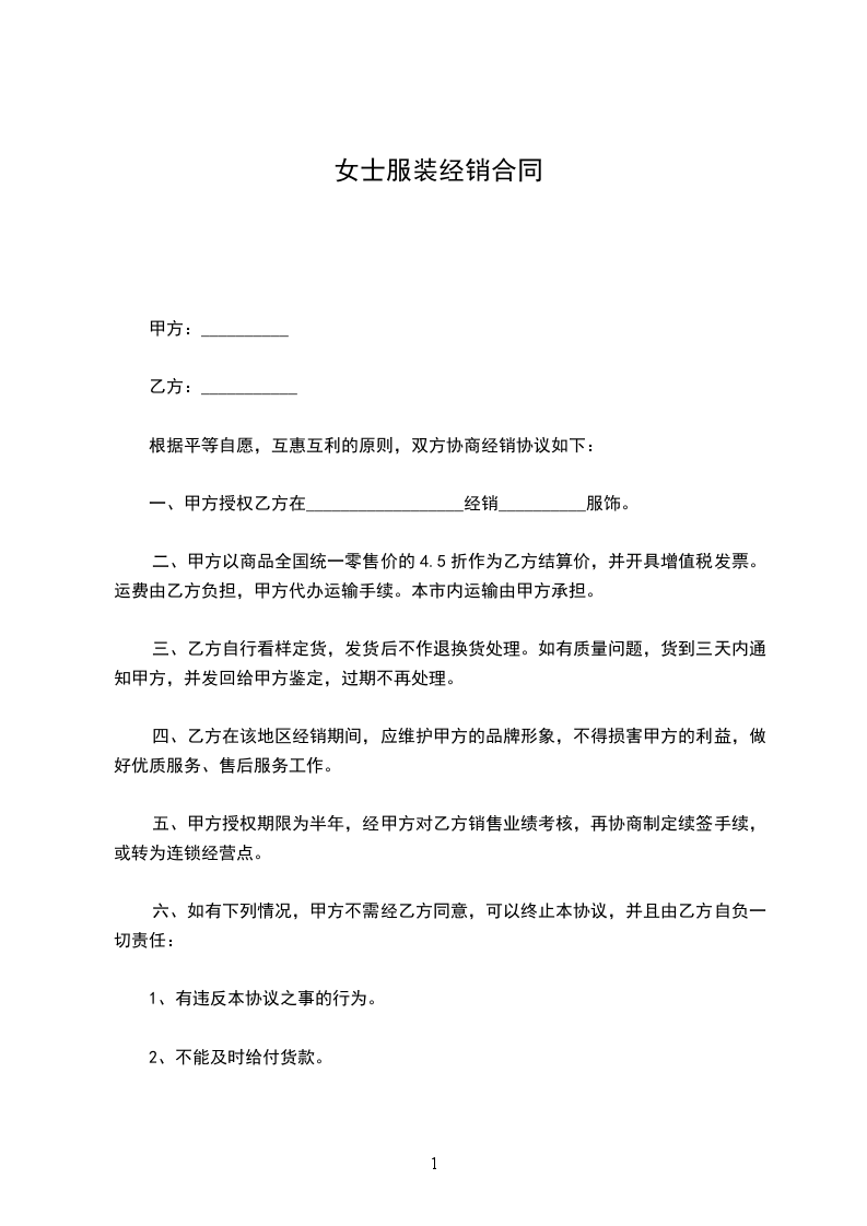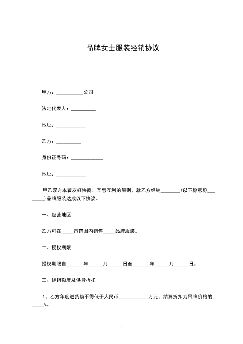 一、甲方授权乙方在__________________经销__________服饰。