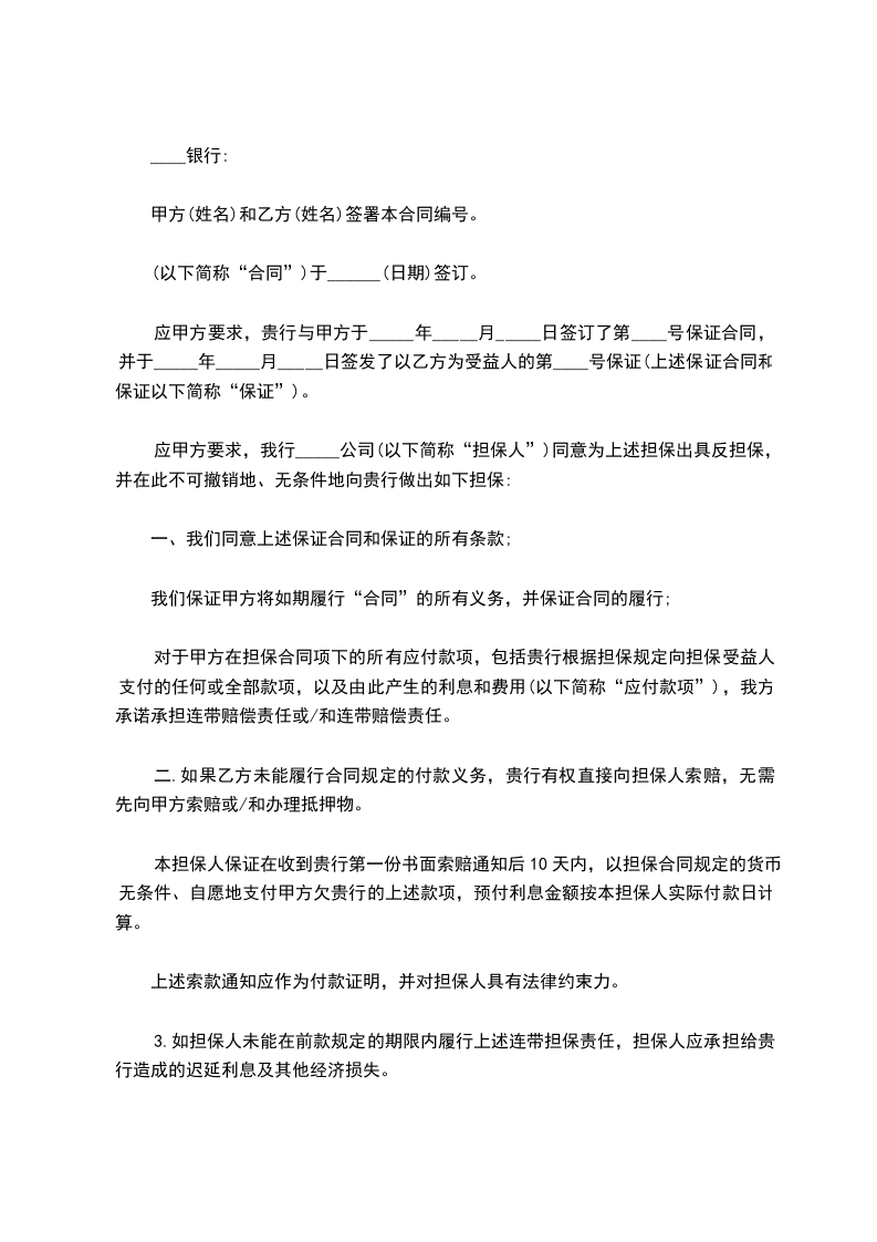 应甲方要求,我行_____公司(以下简称“担保人”)同意为上述担保出具反担保,并在此不可撤销地、无条件地向贵行做出如下担保: