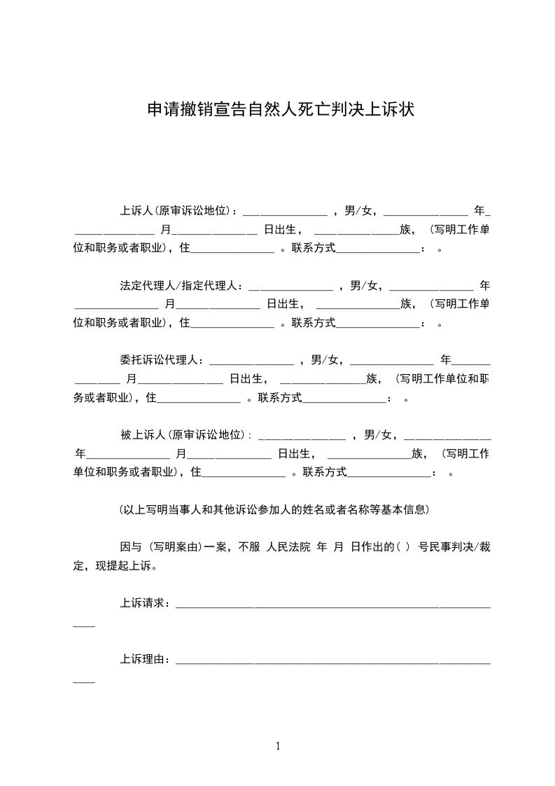 你院已于×××年××月×××日作出(××××)×民特字第××号民事判决,宣告×××(写明姓名、性别、年龄、籍贯、职业、原住址)失踪/死亡。现依据 ,可以证明×××已重新出现。依照《中华人民共和国民事诉讼法》第一百八十六条之规定,特向你院申请作出新判决,撤销(××××)×民特字第××号民事判决。