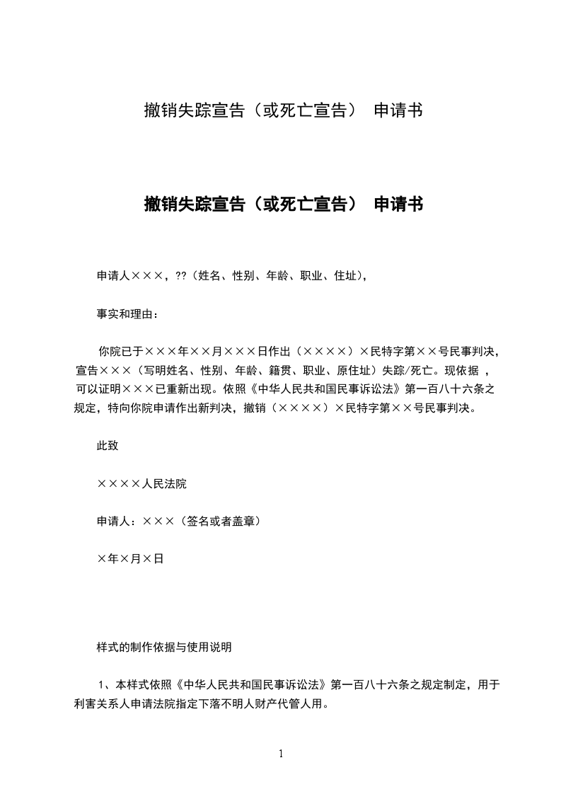撤销失踪宣告(或死亡宣告) 申请书