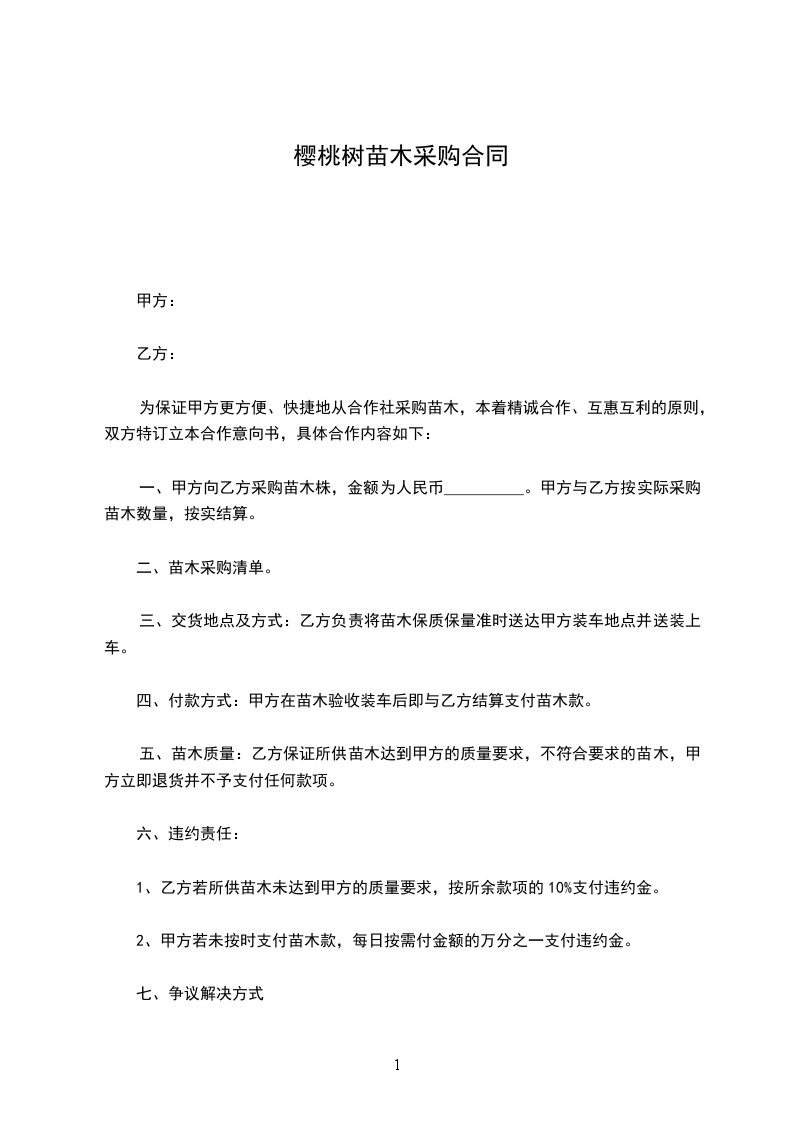 一、甲方向乙方采购苗木株,金额为人民币__________。甲方与乙方按实际采购苗木数量,按实结算。