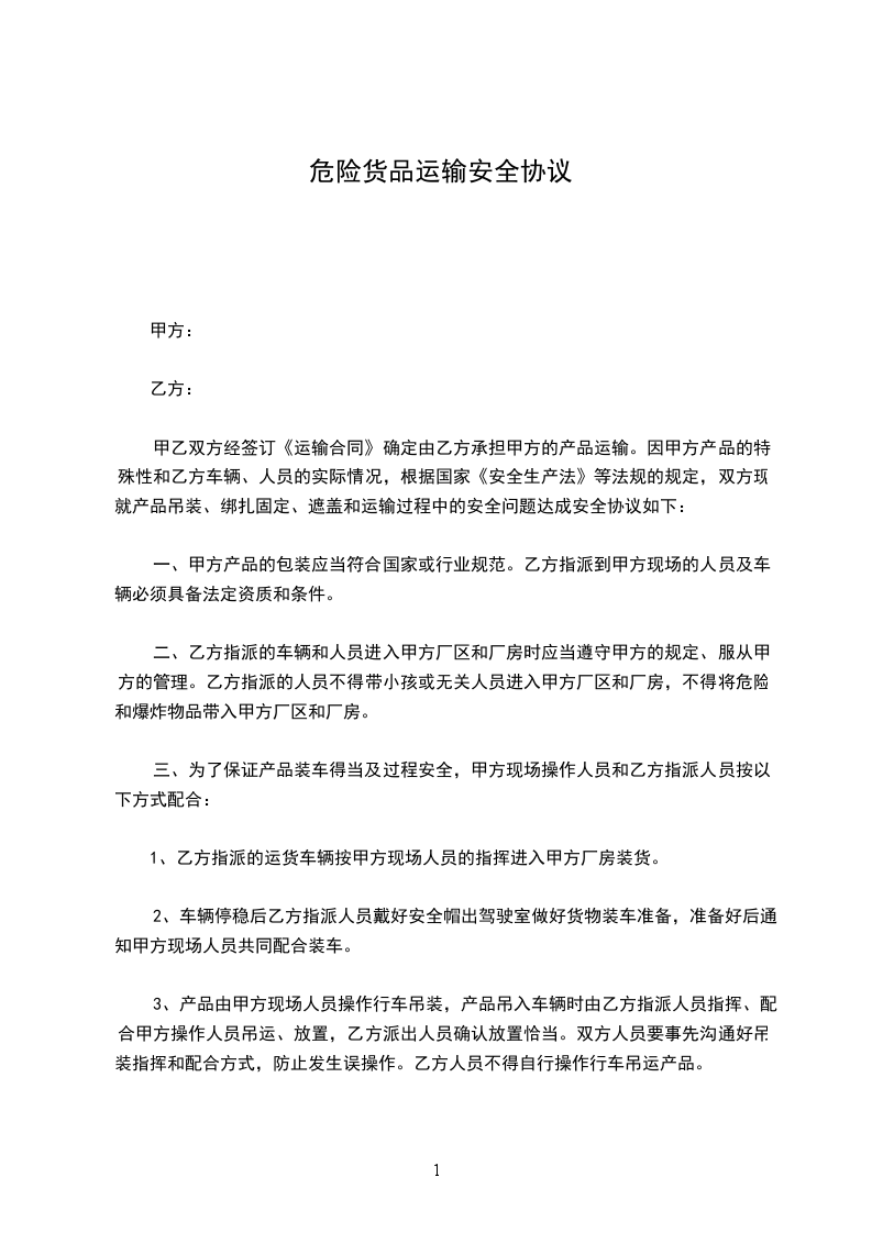 甲乙双方经签订《运输合同》确定由乙方承担甲方的产品运输。因甲方产品的特殊性和乙方车辆、人员的实际情况,根据国家《安全生产法》等法规的规定,双方现就产品吊装、绑扎固定、遮盖和运输过程中的安全问题达成安全协议如下: