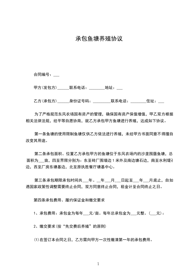 为了严格规范东风农场国有资产的管理,确保国有资产保值增值,甲乙双方根据相关法律法规,经平等自愿协商,就乙方承包甲方鱼塘进行养殖,达成如下协议。