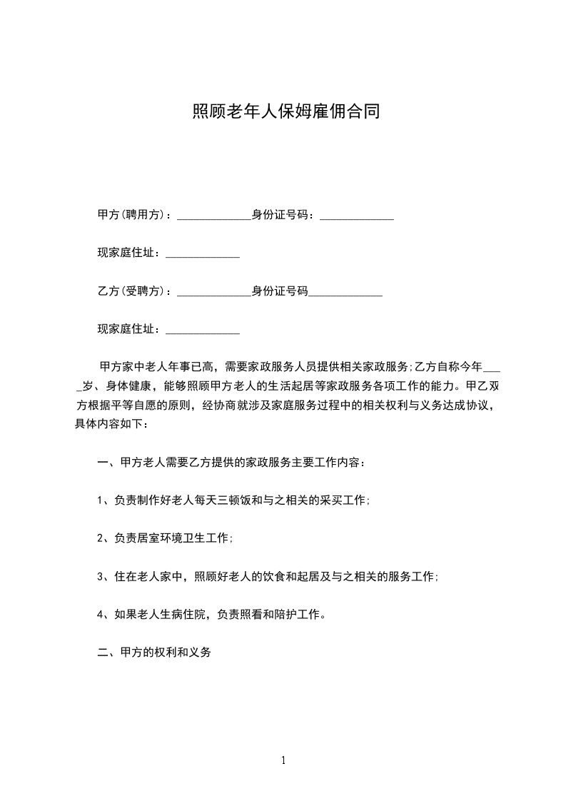 甲方家中老人年事已高,需要家政服务人员提供相关家政服务;乙方自称今年____岁、身体健康,能够照顾甲方老人的生活起居等家政服务各项工作的能力。甲乙双方根据平等自愿的原则,经协商就涉及家庭服务过程中的相关权利与义务达成协议,具体内容如下:
