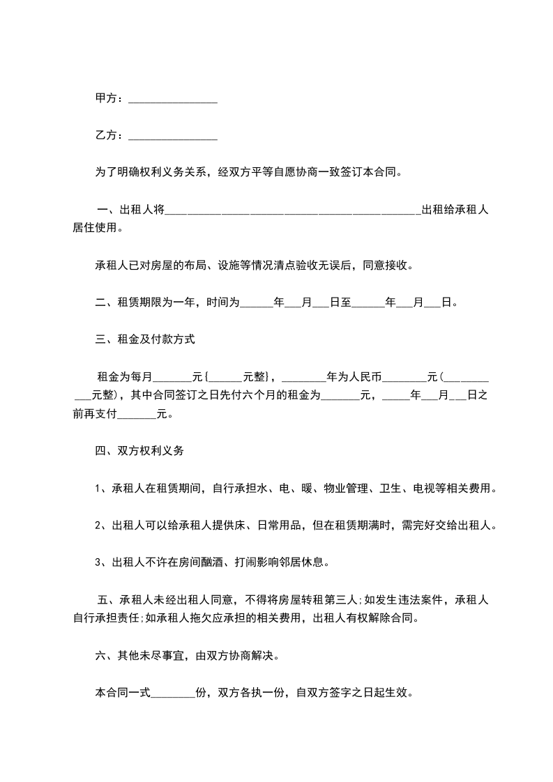 3.在租用期内,甲方必须确保乙方的正常居住,不得将乙方租用的房屋转租(卖)给任何第三者;或在租赁期内房租加价。