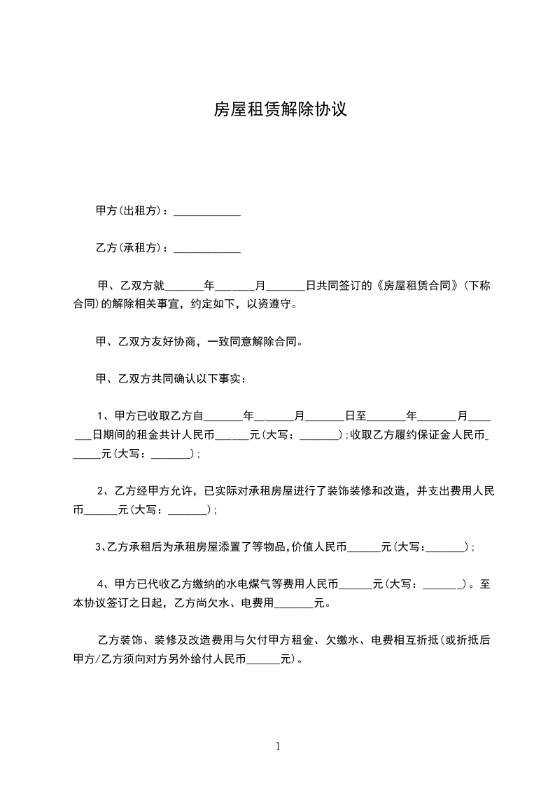 甲、乙双方就_______年_______月_______日共同签订的《房屋租赁合同》(下称合同)的解除相关事宜,约定如下,以资遵守。