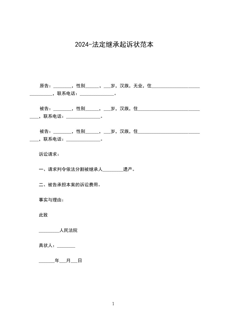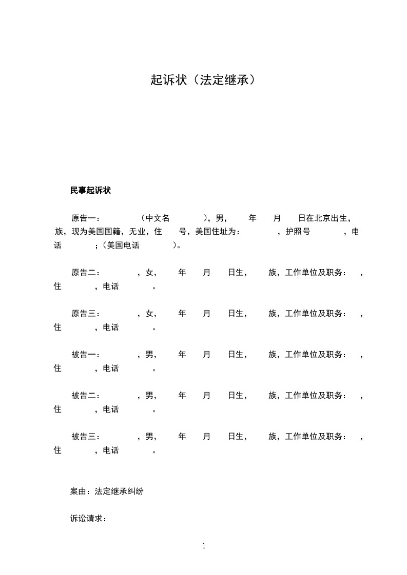 民事起诉状 原告一: (中文名 ),男, 年 月 日在北京出生, 族,现为美国国籍,无业,住 号,美国住址为: ,护照号 ,电话 ;(美国电话 )。