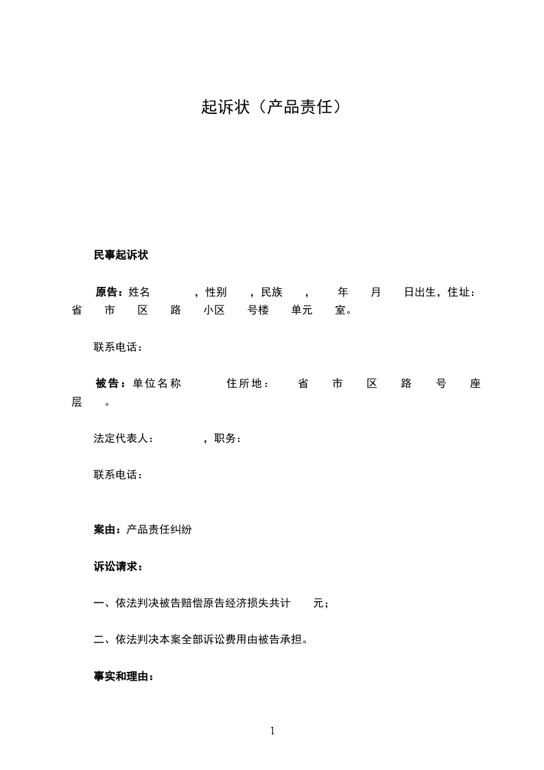 民事起诉状 原告:姓名 ,性别 ,民族 , 年 月 日出生,住址: 省 市 区 路 小区 号楼 单元 室。
