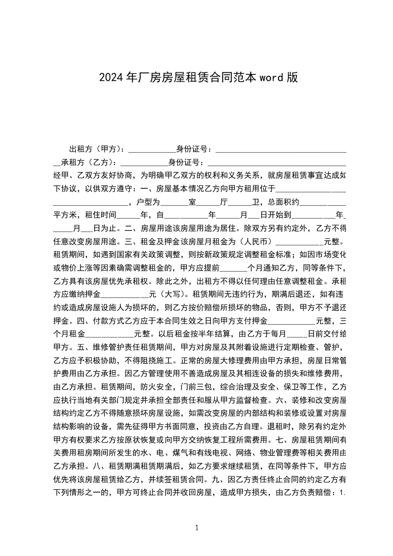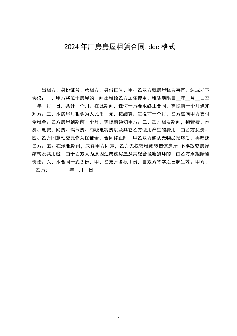 1、甲、乙双方约定,该厂房租赁每日每平方米建筑面积租金为人民币_______元。月租金为人民币_______元,年租金为_______元。