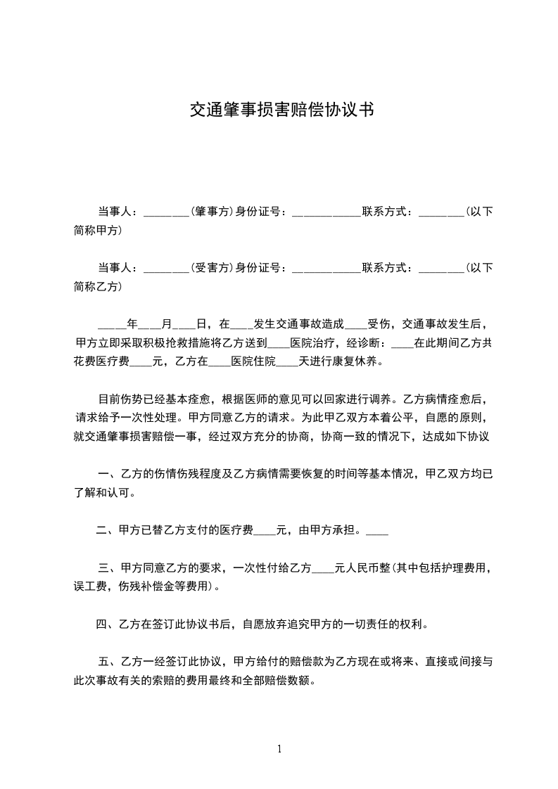 目前伤势已经基本痊愈,根据医师的意见可以回家进行调养。乙方病情痊愈后,请求给予一次性处理。甲方同意乙方的请求。为此甲乙双方本着公平,自愿的原则,就交通肇事损害赔偿一事,经过双方充分的协商,协商一致的情况下,达成如下协议:
