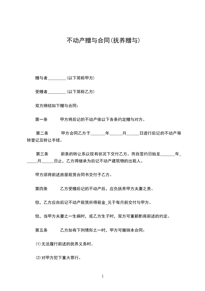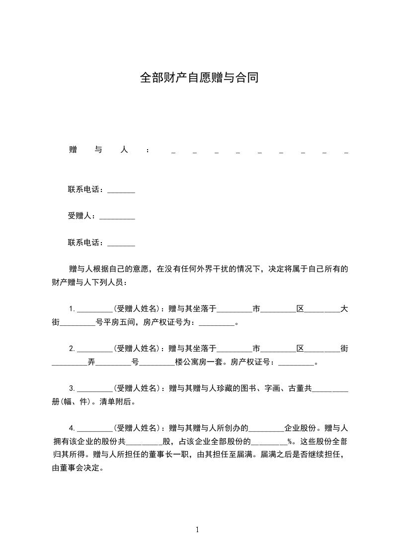 一、甲方自愿将其座落于______________,建筑面积______________平方米,产权证号的房屋一套赠与给乙方,乙方自愿接受该房屋。
