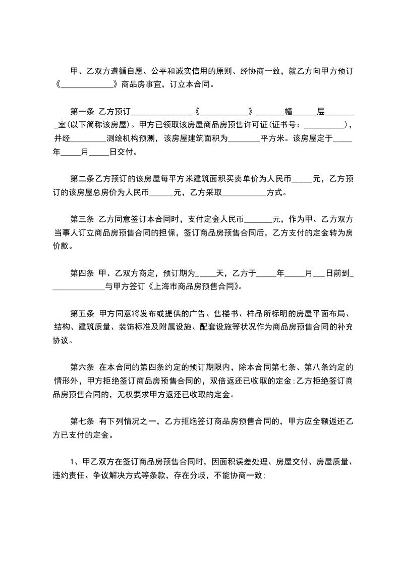 第四条 甲、乙双方商定,预订期为_____天,乙方于_____年_____月___日前到______________与甲方签订《上海市商品房预售合同》。