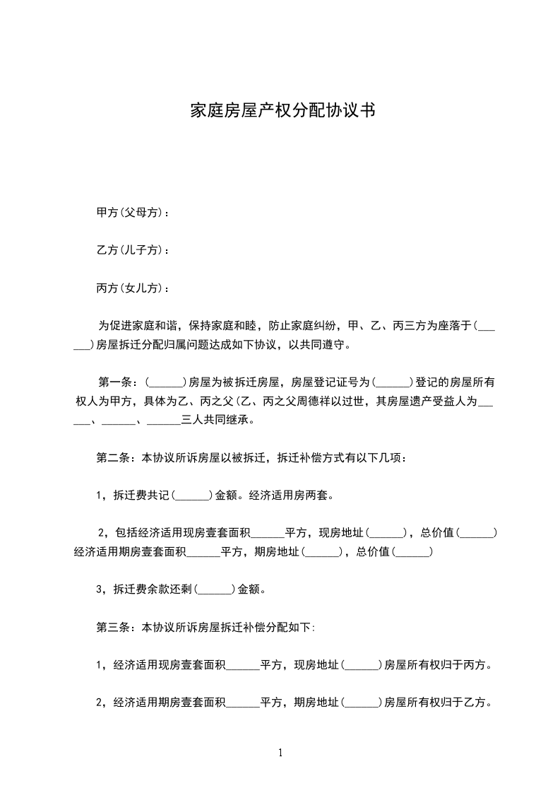 为促进家庭和谐,保持家庭和睦,防止家庭纠纷,甲、乙、丙三方为座落于(______)房屋拆迁分配归属问题达成如下协议,以共同遵守。