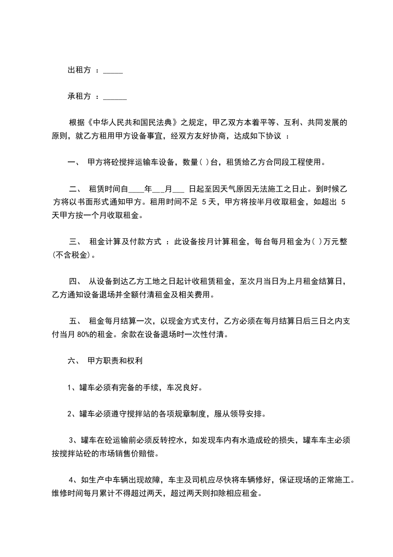 1、砼搅拌运输车一台车配备一名操作工人为乙方服务至合同期满,并承担其工资和奖金。