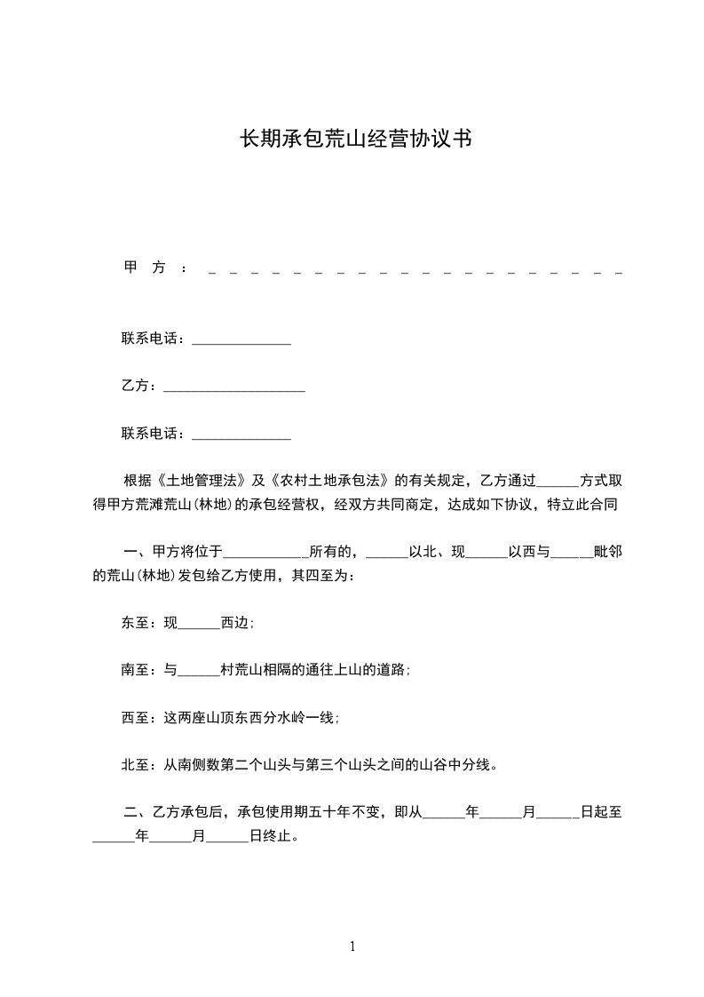 根据《土地管理法》及《农村土地承包法》的有关规定,乙方通过______方式取得甲方荒滩荒山(林地)的承包经营权,经双方共同商定,达成如下协议,特立此合同: