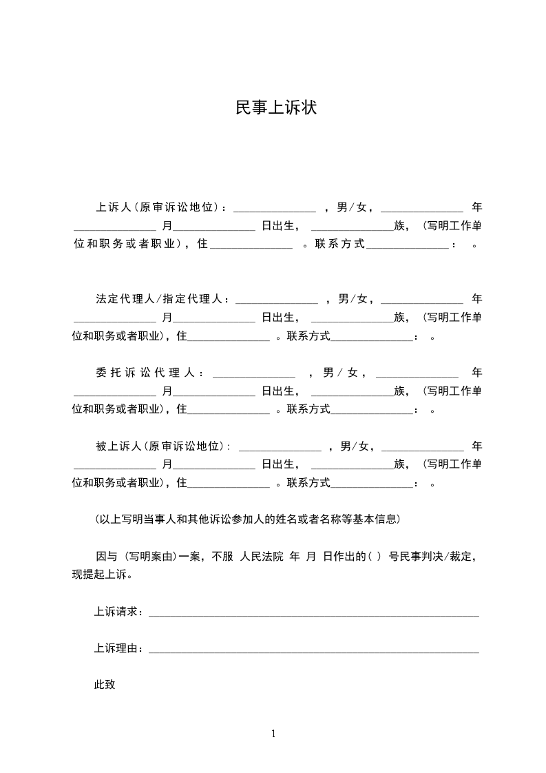 上诉人(原审诉讼地位):_______________ ,男/女,_______________ 年_______________ 月_______________ 日出生, _______________族, (写明工作单位和职务或者职业),住_______________ 。联系方式_______________: 。