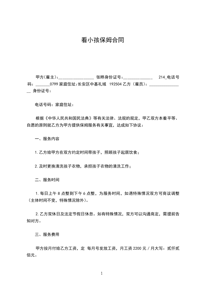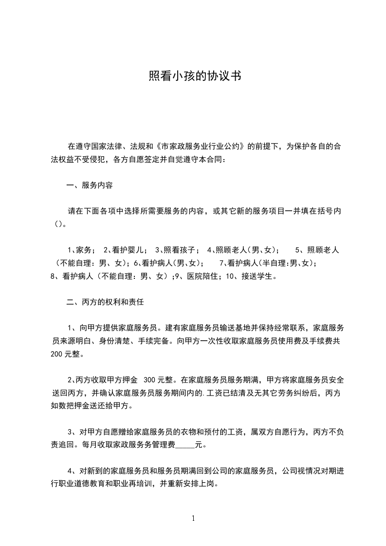 1.乙方的服务内容主要包括:照看孩子,做家务,做饭,做清洁。