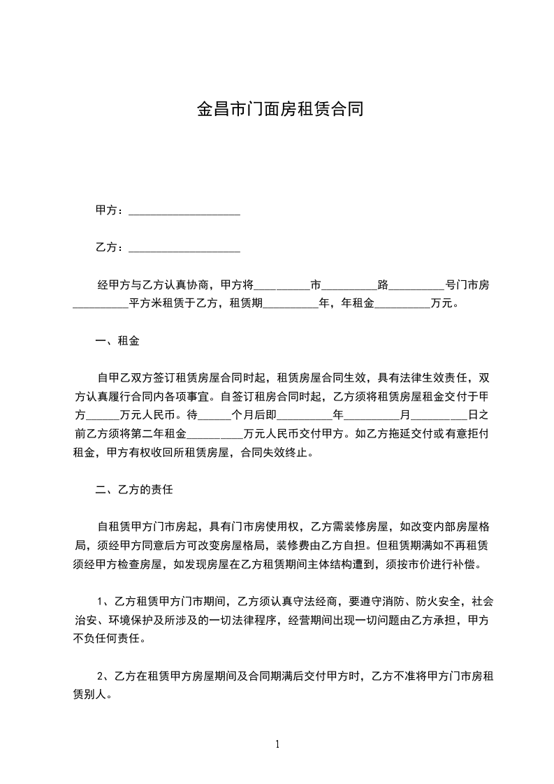 经甲方与乙方认真协商,甲方将__________市__________路__________号门市房__________平方米租赁于乙方,租赁期__________年,年租金__________万元。