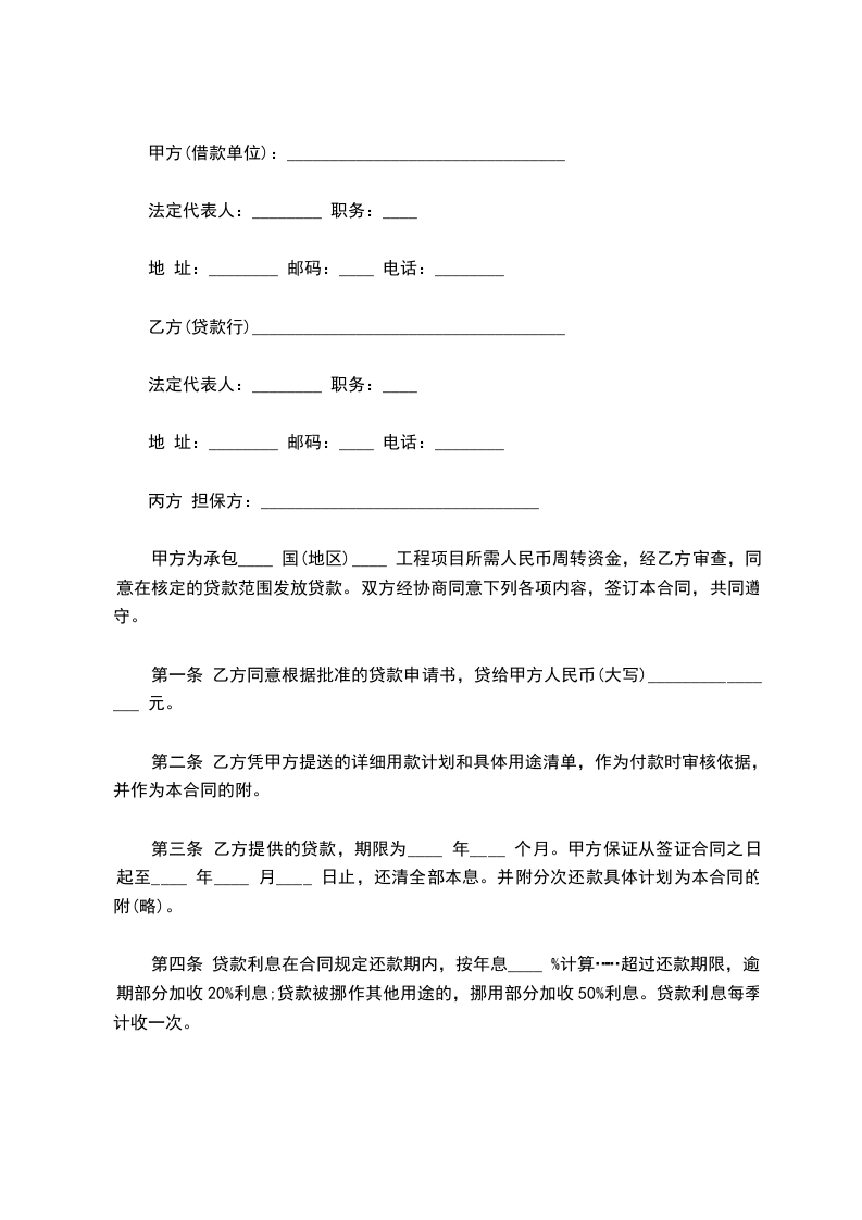 甲方为承包____国(地区)____工程项目所需人民币______周转资金,经乙方审查,同意在核定的贷款范围发放贷款。双方经协商同意下列各项内容,签订本合同,共同遵守。